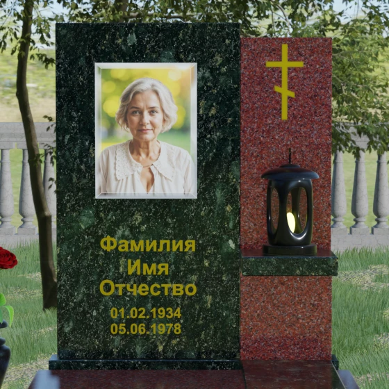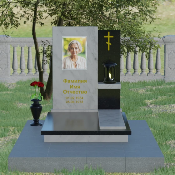 Кому подойдет: Данная модель является универсальной благодаря своему лаконичному и одновременно глубокому дизайну. Она станет достойным выбором как для мужчины, так и для женщины. Строгость линий и золотые акценты подчеркнут статус и мужество, а плавные изгибы верхней грани привнесут нотки женственности и нежности. Этот мемориал выбирают те, кто хочет выразить глубокое уважение и создать на кладбище место, преисполненное достоинства и тишины, где каждый элемент — от лампады до фактуры камня — говорит о вечной любви.