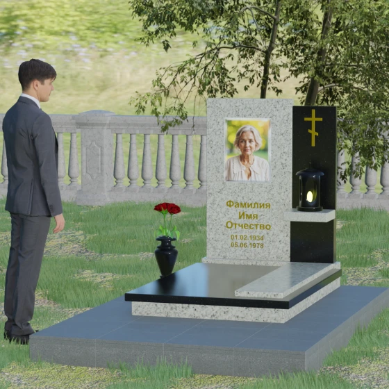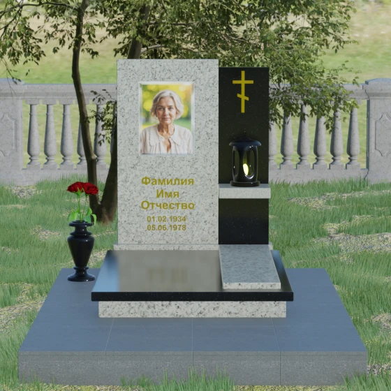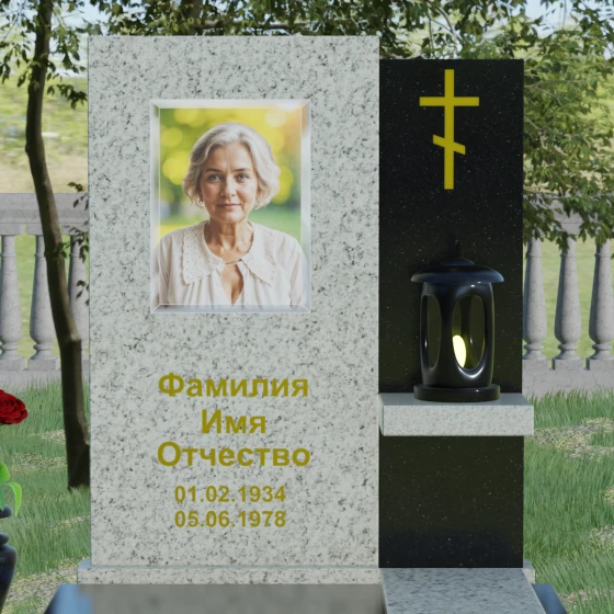 Представленная модель отличается изысканной асимметрией и сложной геометрией, где две вертикальные стелы разной высоты сливаются в единый гармоничный ансамбль. Левая часть, более высокая и массивная, имеет плавный дугообразный срез в верхней части. Этот мягкий изгиб символизирует бесконечность жизненного пути и обретенный вечный покой, смягчая строгость натурального камня. На этой панели располагается портрет и основная информация, выполненная глубокой гравировкой с золочением. Правая часть композиции, выполненная из контрастного камня, служит духовным акцентом: на ней закреплен лаконичный православный крест, сияющий золотом, что подчеркивает веру и надежду на вечную жизнь.