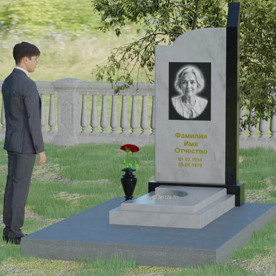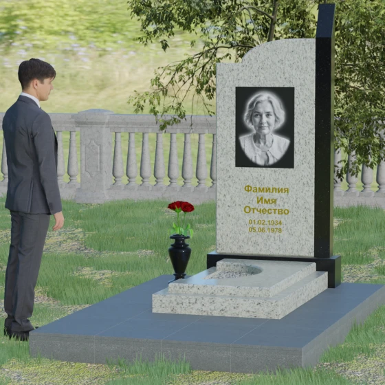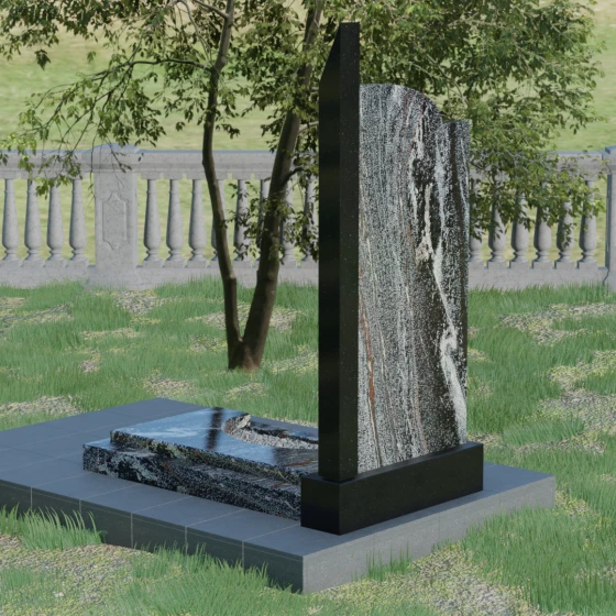 Данная мемориальная композиция представляет собой образец современного архитектурного искусства, где строгая геометрия встречается с мягкой природной грацией. Дизайн изделия построен на эстетике асимметрии: левый край стелы выполнен в виде четкого, волевого «шага», который мгновенно переходит в плавную, нисходящую дугу с правой стороны. Такая форма символизирует баланс между земной твердостью и бесконечным небесным покоем. Вертикальная стела дополнена узким акцентным столпом из контрастного камня, который создает мощную вертикаль, визуально устремляя всю конструкцию ввысь. Тщательно выверенные пропорции позволяют этому монументу органично вписаться в ландшафт любого мемориального комплекса, выделяясь своей лаконичностью и благородством линий.