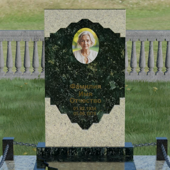 Данное ритуальное изделие представляет собой подлинный триумф художественного минимализма и гармонии контрастов. Центральным элементом композиции является вертикальная стела, выполненная в уникальной технике сочетания двух видов природного камня. Геометрия изделия строится на строгих, безупречно выверенных линиях внешнего контура и изысканной, фигурной резьбе внутреннего сегмента. Светлая вставка из мелкозернистого гранита, обрамленная темным камнем, напоминает античный портал или драгоценную раму, выполненную в стиле барокко. Фигурные фаски по краям светлого элемента создают ритмичный узор, который смягчает строгость прямоугольной формы, придавая мемориалу индивидуальность и торжественность.