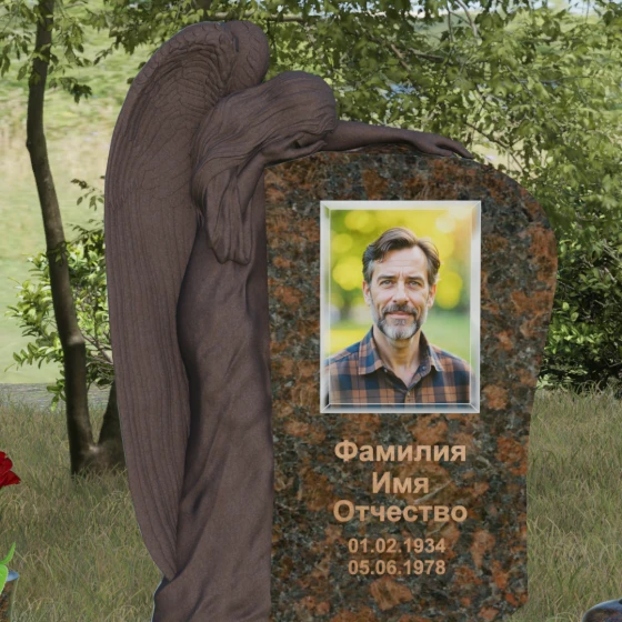 Центральным художественным элементом композиции является искусная скульптура скорбящего ангела, выполненная в технике глубокого барельефа. Фигура небесного защитника органично интегрирована в левую часть каменного полотна. Мы видим детальную проработку каждого перышка на опущенных крыльях, мягкие, ниспадающие складки плащаницы и кроткий изгиб шеи — ангел склонил голову в знак вечного сострадания. Особого внимания заслуживает игра фактур: матовая, бархатистая поверхность резной фигуры контрастирует с безупречным зеркальным блеском основной плоскости, на которой располагается портрет и эпитафия. Такая полировка создает эффект глубокого черного или цветного зеркала, в котором отражается небо, символизируя связь между земным и небесным.
