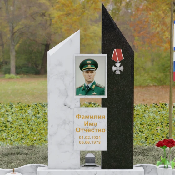 Форма этой модели глубоко символична: две вершины олицетворяют дуализм земного пути и вечной памяти, которые неразрывно связаны в сознании живых. Асимметричные срезы стел вызывают ассоциации с защитой, крепостью и незыблемым оплотом чести. Использование строгой геометрии без лишнего декора подчеркивает прямолинейность характера и волевые качества человека, которому посвящен данный мемориал. Это воплощение защиты и надежности, застывшее в камне, которое транслирует окружающим историю о достоинстве, силе духа и беззаветном служении своему делу.