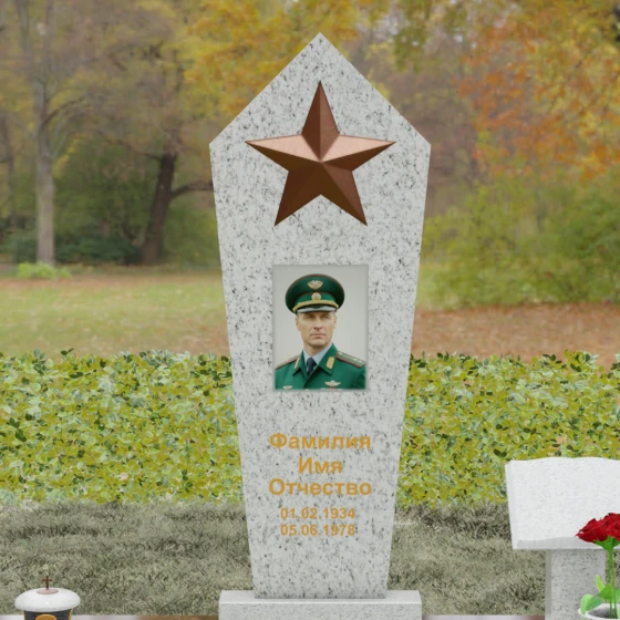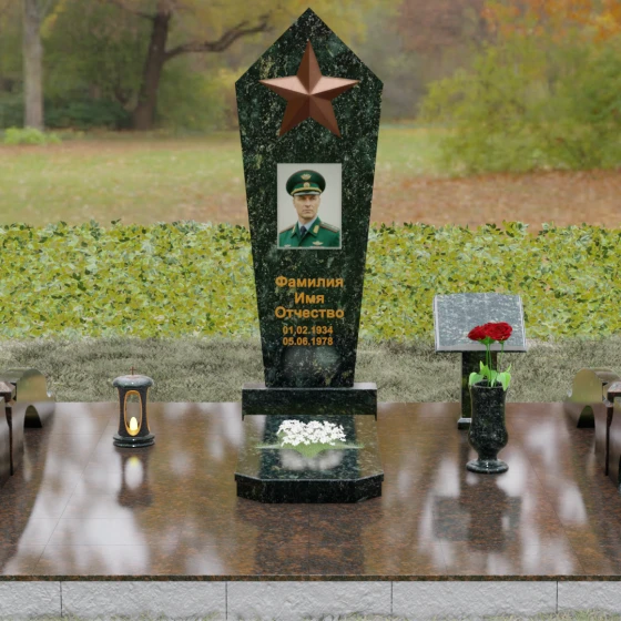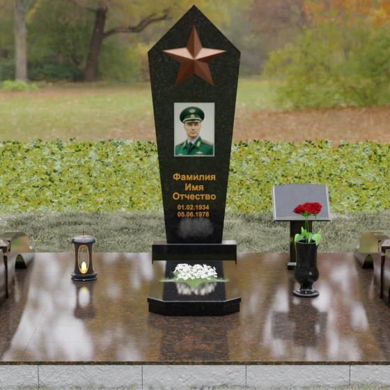 В верхней части стелы расположена объемная пятиконечная звезда, выполненная в технике накладного рельефа. Она является главным смысловым акцентом, контрастируя по цвету и фактуре с зеркальной поверхностью основного камня. Ниже расположен прямоугольный портрет на керамической основе, интегрированный в плоскость стелы с безупречной точностью. Завершает художественный образ гравировка текста, выполненная глубоким шрифтом с золочением, что обеспечивает читаемость надписей на десятилетия вперед.