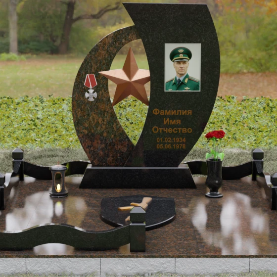 Кому подойдет: Данный мемориальный комплекс спроектирован для увековечивания памяти мужчин, чья жизнь была связана с воинским долгом, государственной службой или героическими поступками. Он станет достойным символом последнего пристанища для ветерана, кадрового офицера или человека с твердым характером. Армейская символика в сочетании с изысканным европейским стилем благоустройства (каменная ваза для живых цветов, лаконичная лампада на постаменте) подчеркивает уважение семьи к заслугам и личным качествам дорогого человека.