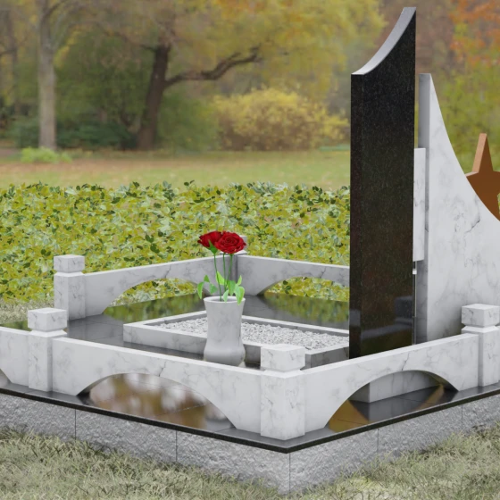 В основе художественной концепции лежит динамичная асимметрия, которая придает всей структуре современный, «европейский» облик. Центральная стела состоит из двух контрастных блоков, объединенных общим основанием. Левая часть, выполненная из темного полированного камня, имеет резкий диагональный срез, направленный вверх. На ее вершине закреплена объемная пятиконечная звезда с эффектом бронзового напыления — мощный акцент, подчеркивающий статус и заслуги покойного. Правая часть композиции представляет собой высокий вертикальный пилон из фактурного коричнево-красного гранита, на верхнем сегменте которого расположена детальная реплика ордена Мужества.