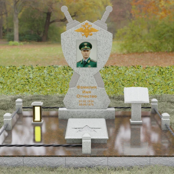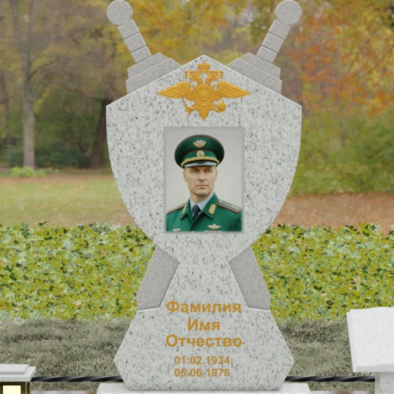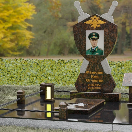Кому подойдет: Данная мемориальная композиция разработана специально для тех, кто посвятил свою жизнь служению Отечеству. Она станет идеальным выбором для оформления места захоронения профессионального военного, сотрудника правоохранительных органов, ветерана или человека, чья жизнь была примером мужества и дисциплины. Строгие линии, военная символика и монументальность формы без лишних слов расскажут о силе характера, доблести и чести того, кто нашел здесь свой последний приют.