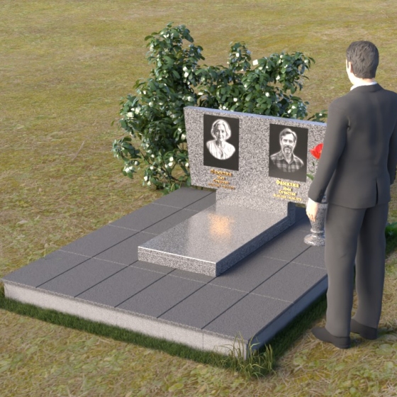 Этот памятник представляет собой изысканную композицию, где строгость линий сочетается с плавными, утонченными деталями. Стела имеет прямоугольную форму с асимметричной верхней гранью. С левой стороны верхний угол плавно скошен вниз, создавая ощущение ниспадающей драпировки или крыла ангела, оберегающего покой усопших. Правый верхний угол стелы остается прямым, что придает конструкции визуальную устойчивость и завершенность. Боковые грани стелы тщательно отполированы, что создает эффект зеркального блеска, отражающего окружающий мир и символизирующего связь между земным и небесным. Под стелой располагается горизонтальная плита меньшего размера, также выполненная в зеркальной полировке, создавая эффект единого целого и усиливая визуальную глубину композиции. Все элементы памятника установлены на широкое основание, облицованное плиткой серого цвета, что обеспечивает устойчивость и долговечность конструкции.