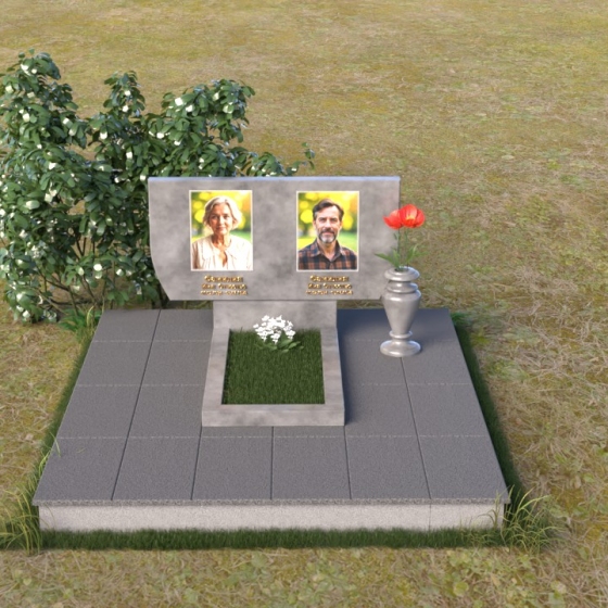 Памятник ПГ015 представляет собой композицию, состоящую из массивной стелы, горизонтальной плиты и тумбы. Стела, выполненная в форме прямоугольника со слегка скошенными верхними углами, создает ощущение надежности и основательности. Зеркальная полировка камня придает ей благородный блеск, отражая свет и создавая игру теней, подчеркивающую глубину и объем. На стеле располагаются два портрета, выполненные с высокой точностью, а также памятные надписи, выполненные золотым шрифтом. Справа от портретов, словно символ вечной памяти, размещена небольшая ваза, в которой можно разместить живые или искусственные цветы.