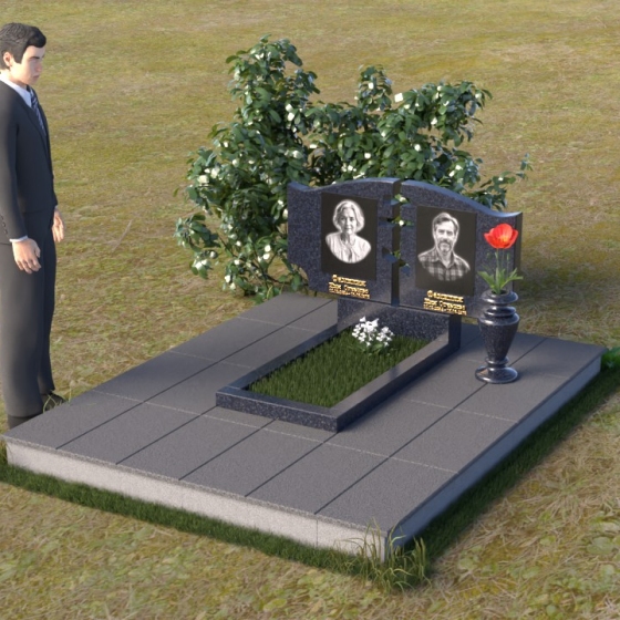 Величественная стела памятника ПГ016 представляет собой композицию из двух вертикальных элементов, объединенных общей идеей и стилем. Каждый элемент имеет свою индивидуальную форму, но вместе они создают гармоничный и целостный образ. Стела выполнена из полированного гранита глубокого черного цвета, который служит идеальным фоном для гравировки портретов и надписей. Контраст между гладкой, зеркальной поверхностью и выгравированными изображениями создает эффект глубины и выразительности. Между двумя стелами прорезана фигура креста, символизирующая веру и духовность. Этот элемент добавляет композиции особое значение и подчеркивает ее сакральный характер. Справа от портрета выгравирована изящная роза, ее лепестки искусно проработаны, создавая ощущение объема и реалистичности. Цветы символизируют любовь, память и скорбь об ушедшем.