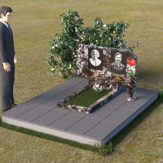 В верхней части памятника располагается вертикальная стела прямоугольной формы с небольшими скошенными углами, придающими ей более мягкий и благородный вид. На поверхности стелы размещены два портрета усопших, выполненные с высокой детализацией. В левом верхнем углу вырезано изображение православного креста, выполненного в лаконичном стиле, подчеркивающем сдержанность и глубину веры. Справа от портретов вырезана изящная роза с детально проработанными лепестками, символизирующая любовь и вечную память. Нижняя часть стелы плавно переходит в горизонтальную плиту, на которой размещается табличка с именами и датами жизни усопших. Горизонтальная плита, в свою очередь, опирается на строгий постамент, обеспечивающий устойчивость всей конструкции.