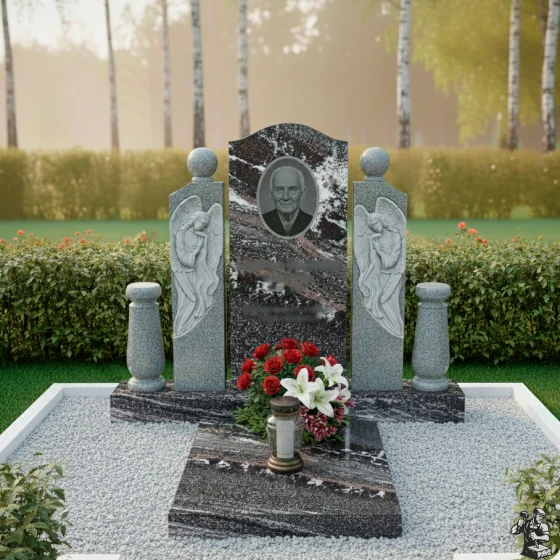 Этот мемориальный комплекс являет собой трогательное сочетание скорби и надежды. Вертикальная стела, обрамленная скульптурами ангелов, словно уносит в мир небесный, где царит покой и умиротворение. Модель доступна в восьми вариантах исполнения, включая семь видов гранита и благородный мрамор Тассос, что позволяет создать памятник, отражающий индивидуальность ушедшего и чувства близких.