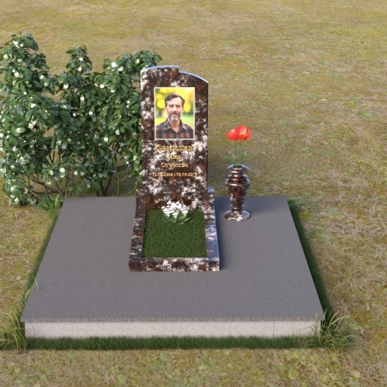 Геометрия модели продумана до мельчайших деталей. Начиная с основания, мы видим широкую плиту, обеспечивающую устойчивость всей конструкции. На ней возвышается горизонтальная плита меньшего размера, выполненная в зеркальной полировке, отражающая небо и окружающий мир, словно запечатлевая в себе мгновения жизни. Вертикальная стела, возвышающаяся над плитой, имеет сглаженные углы и плавные переходы, смягчающие строгость формы. Верхняя часть стелы, с ее деликатными сколами, придает ей уникальность и неповторимость. Рядом со стелой располагается небольшая ваза, выполненная в том же стиле, предназначенная для живых цветов, символизирующих вечную память и любовь.