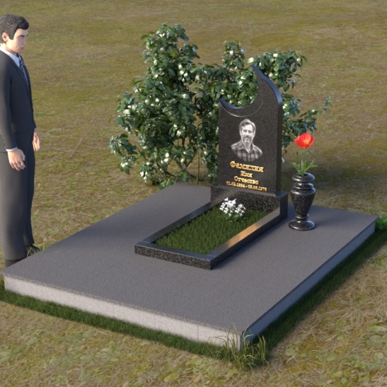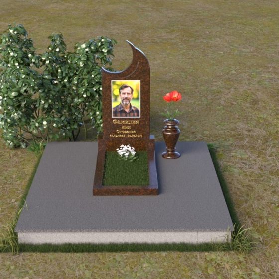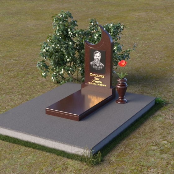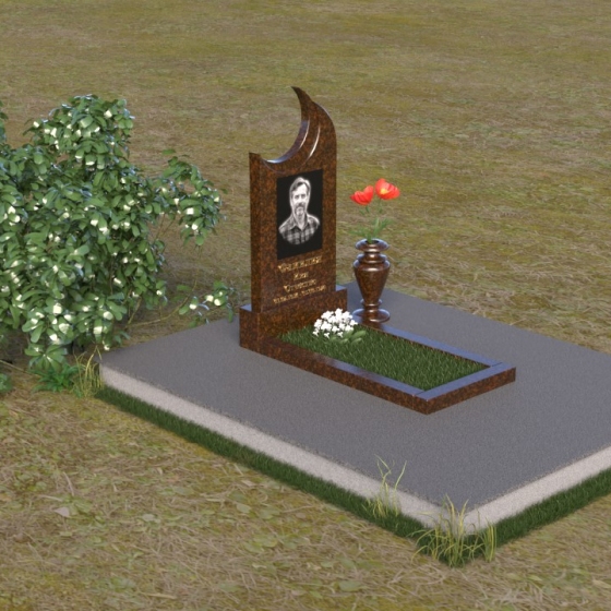 Этот гранитный монумент притягивает взгляд своей необычной формой. Основной элемент – вертикальная плита, увенчанная плавной, асимметричной дугой, напоминающей полумесяц. Её левая сторона чуть выше правой, что создает ощущение динамики и незавершенности, словно оборвавшейся жизни. Поверхность лицевой стороны отполирована до зеркального блеска, отражая небо и окружающий пейзаж, создавая иллюзию глубины и пространства. На полированной поверхности выгравирован портрет усопшего, надпись с именем и датами жизни. Нижняя часть монумента, сопрягаясь с горизонтальной плитой, образует единый ансамбль. Переход между вертикальной и горизонтальной плоскостями подчеркнут небольшой ступенькой, добавляющей конструкции объема. Горизонтальная плита, в свою очередь, также отполирована до блеска, отражая свет и усиливая эффект монументальности. Фаски на гранях плиты аккуратно обработаны, что придает памятнику завершенный и элегантный вид. Сбоку от монумента расположена небольшая гранитная ваза, предназначенная для живых цветов, которые станут символом вечной памяти и любви.