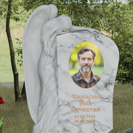 Форма этого надгробия лишена агрессивных острых углов в верхней части, что придает ему мягкость и одухотворенность. Асимметричная верхушка основного массива плавно огибает фигуру ангела, создавая ощущение защиты и покровительства. С точки зрения символизма, ангел здесь выступает не только как страж души, но и как медиатор между мирами, разделяющий горечь утраты с живыми. Каменные шары на столбиках ограждения отсылают к вечности и бесконечности бытия. Массивность основания и использование цельных плит для мощения участка олицетворяют устойчивость памяти, которую не в силах разрушить ни ветры, ни дожди.