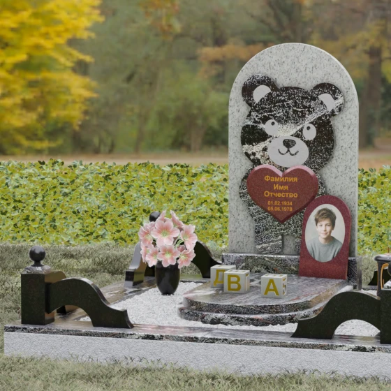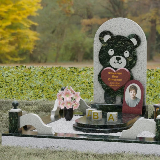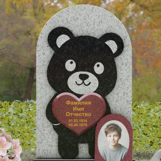Данная мемориальная композиция представляет собой уникальное сочетание трогательной нежности и величественной непоколебимости камня. В центре художественного замысла лежит глубокий символизм: фигура медвежонка, бережно держащего в лапах сердце, олицетворяет чистоту, бесконечную родительскую любовь и защиту, которую близкие стремятся подарить даже после ухода дорогого человека. Это надгробие из натурального камня выполнено в технике художественного комбинирования различных пород, что создает потрясающий визуальный объем. Массивная светлая стела с полукруглым завершением служит идеальным фоном для темного силуэта, вырезанного с ювелирной точностью. Игра контрастов между зеркальной полировкой черного камня и благородной текстурой светлого гранита подчеркивает каждую деталь: от доброго взгляда лесного покровителя до мягких контуров его фигуры.