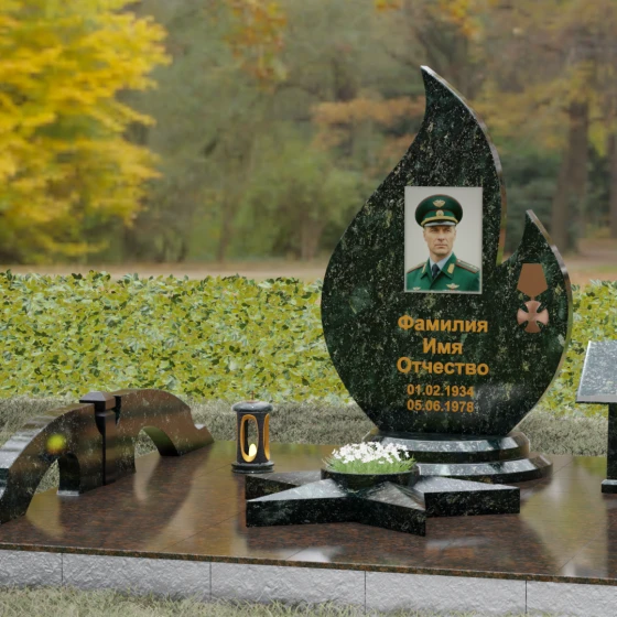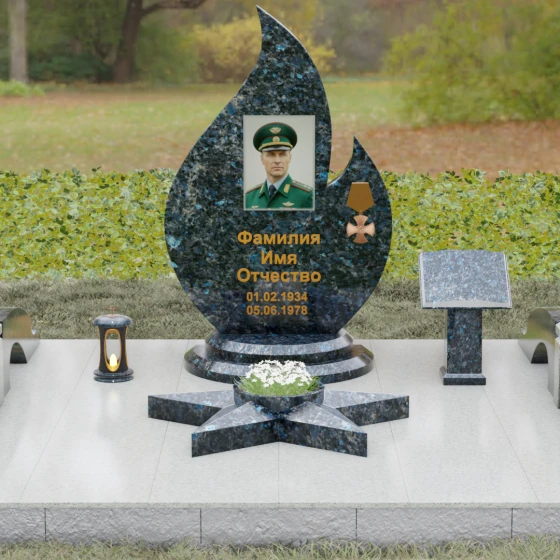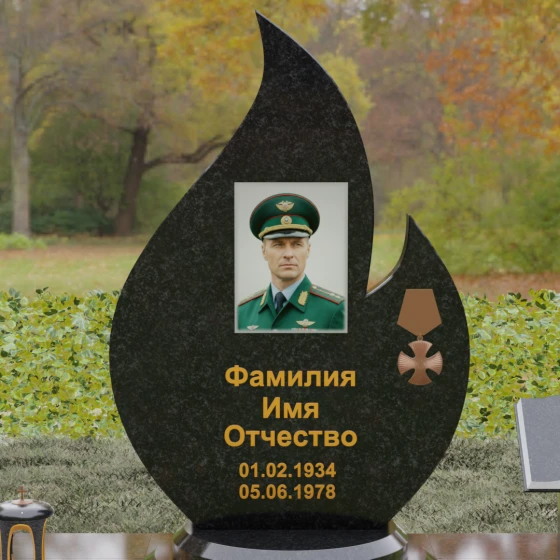 Центральное мемориальное изделие выполнено в уникальной форме застывшего пламени, которое стремится ввысь, символизируя неугасаемую энергию жизни. Плавные, текучие изгибы боковых граней переходят в изящное заостренное навершие, создавая динамичный и одновременно строгий силуэт. Особое внимание стоит уделить обработке камня: по всему периметру лицевой грани снята широкая фаска, которая благодаря безупречной зеркальной полировке создает великолепную игру света и тени, подчеркивая объем и скульптурность формы.