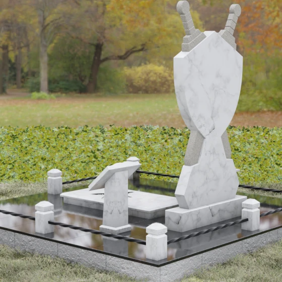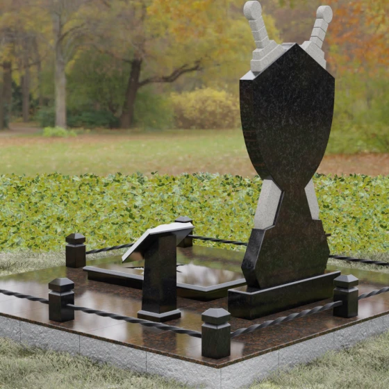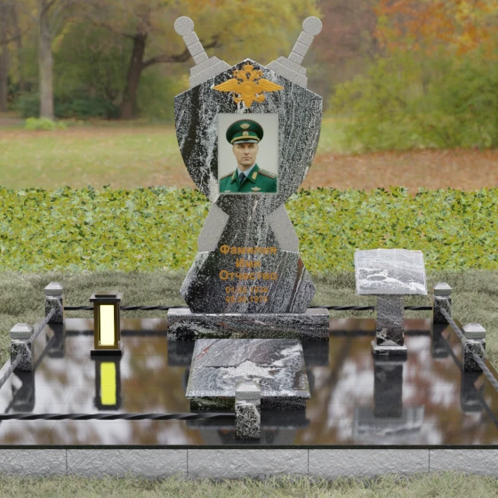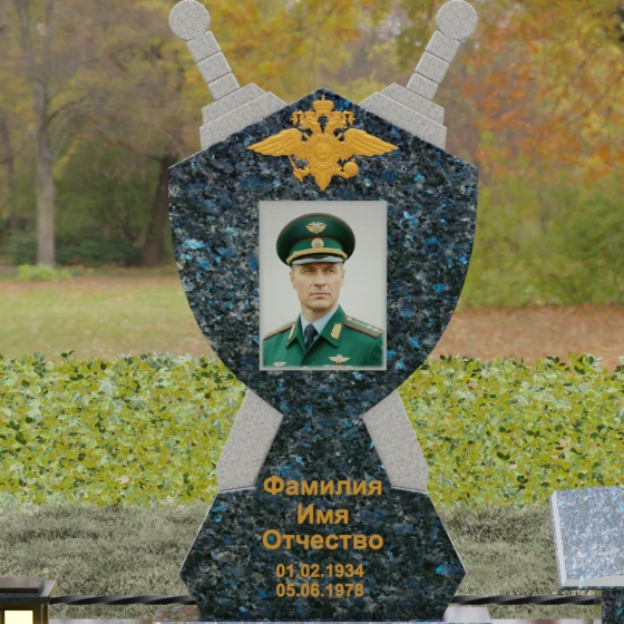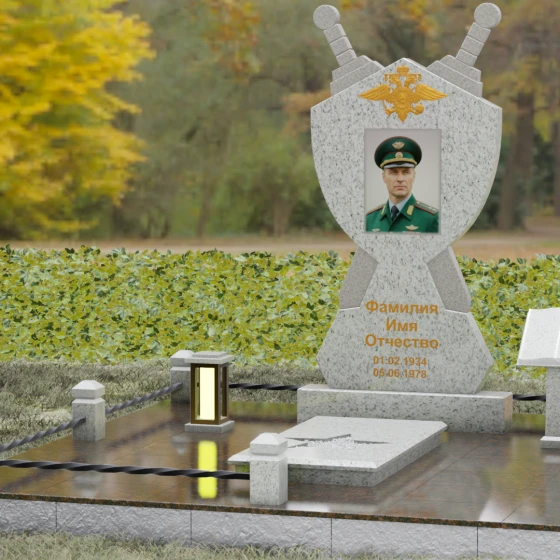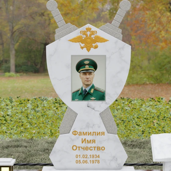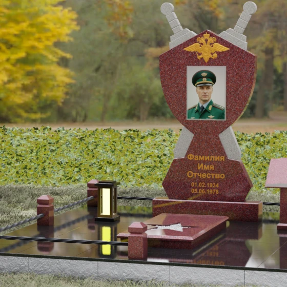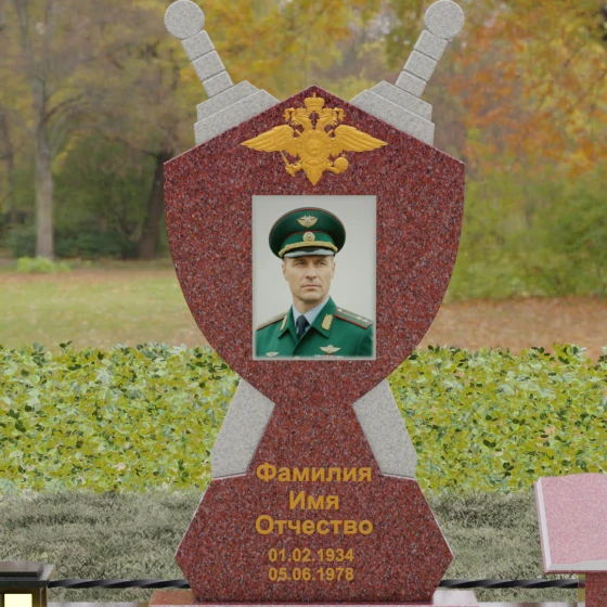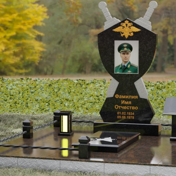 Кому подойдет: Данная мемориальная композиция разработана специально для тех, кто посвятил свою жизнь служению Отечеству. Она станет идеальным выбором для оформления места захоронения профессионального военного, сотрудника правоохранительных органов, ветерана или человека, чья жизнь была примером мужества и дисциплины. Строгие линии, военная символика и монументальность формы без лишних слов расскажут о силе характера, доблести и чести того, кто нашел здесь свой последний приют.