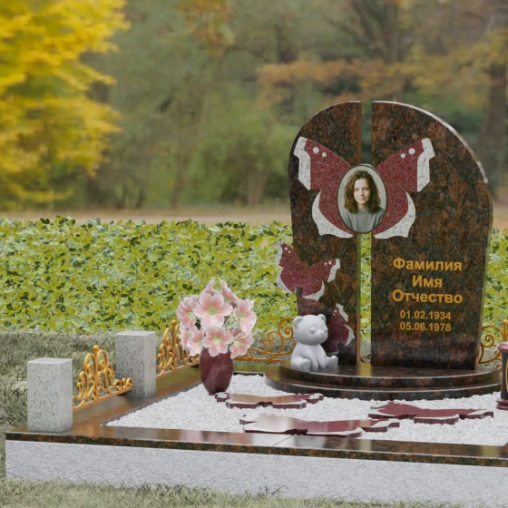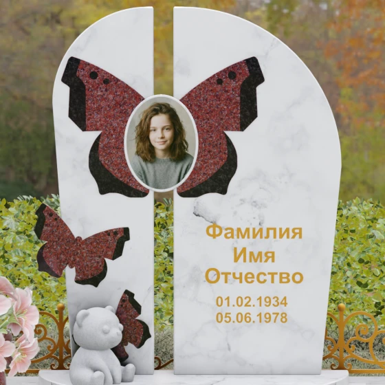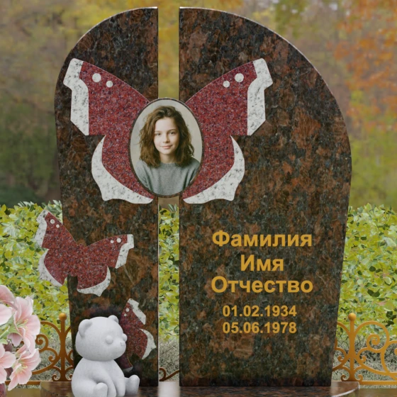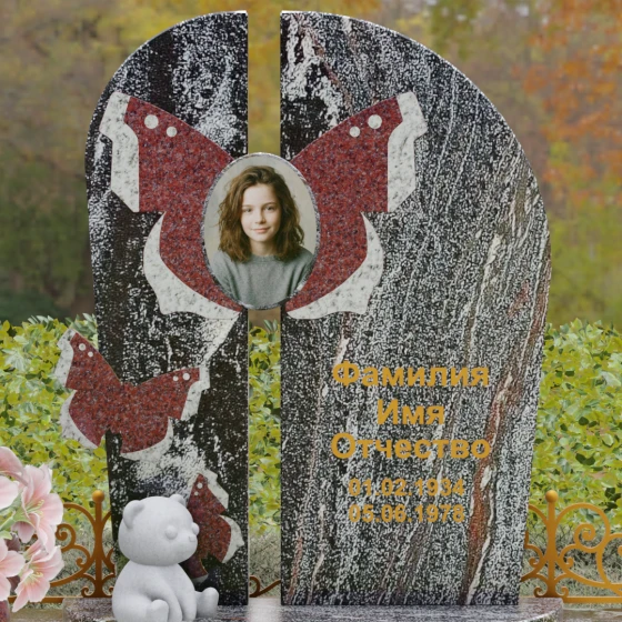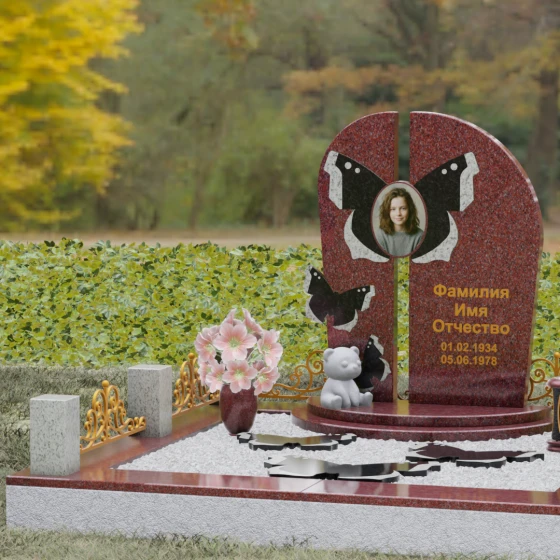 Центральным элементом ансамбля выступает величественная вертикальная стела, разделенная узким вертикальным просветом на две симметричные части. Этот архитектурный прием создает эффект воздушности и позволяет свету проникать сквозь плотную массу камня, символизируя открытость небесных врат и свободу духа. Верхушка стелы оформлена плавным полукруглым изгибом, лишенным острых углов, что дарит ощущение абсолютного умиротворения и вечного покоя. Главным художественным акцентом является мастерски выполненная инкрустация в виде расправленных крыльев бабочки, которые бережно обрамляют центральный овальный портрет. Контрастная игра фактур — зеркально-черного полированного гранита и насыщенных красных вставок с белым природным рисунком — создает поразительный визуальный объем. Изящная золоченая гравировка шрифта придает оформлению особую торжественность, отчетливо выделяясь на темном фоне камня и сохраняя читаемость на долгие десятилетия.