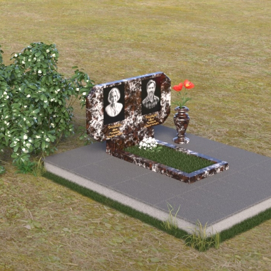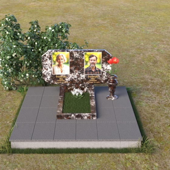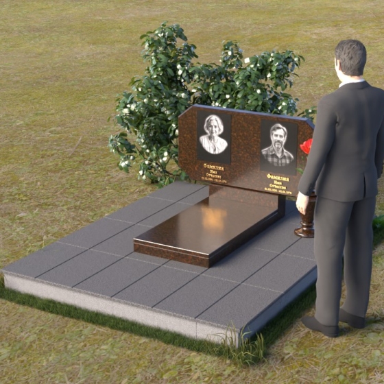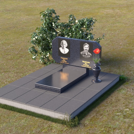Композиция памятника строится на контрасте строгих геометрических форм и плавных линий, символизирующих жизненный путь и обретение покоя. Стела имеет форму, близкую к прямоугольнику, но с элегантно скошенными углами, смягчающими ее строгость. Верхняя часть стелы имеет две небольшие грани, словно фацеты драгоценного камня, добавляющие ей изысканности. Поверхность камня отполирована до зеркального блеска, что подчеркивает глубину черного цвета и создает ощущение торжественности. На лицевой стороне размещены портреты усопших, выполненные с высокой степенью детализации. Ниже портретов выгравированы надписи, выполненные строгим шрифтом. Справа от стелы установлена небольшая ваза, выполненная в том же стиле, что и памятник, и украшенная простым, но элегантным орнаментом.