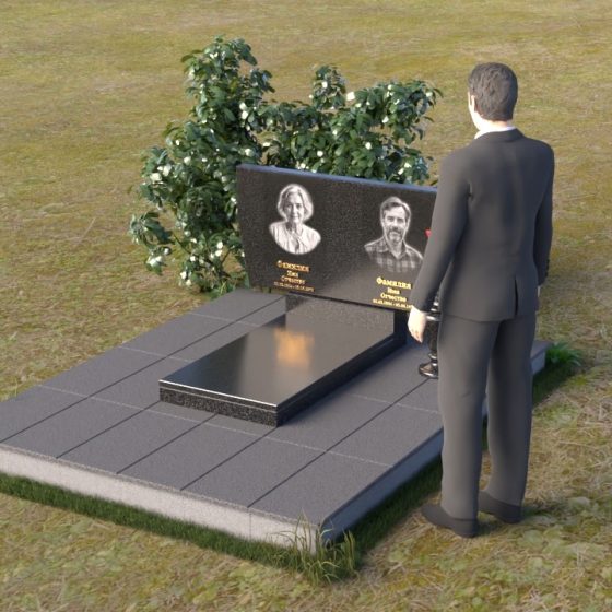 Это ритуальное изделие представляет собой гармоничное сочетание прямых линий и мягких, едва уловимых изгибов, создающих ощущение покоя и умиротворения. Стела имеет прямоугольную форму, но ее верхняя грань слегка скошена, что придает ей визуальную легкость и динамику. Обратите внимание на зеркальную полировку лицевой стороны – она отражает небо и окружающий мир, словно заключая в себе вечность. На полированной поверхности выгравированы портреты усопших и памятные надписи, выполненные с высокой точностью и детализацией. Слева от стелы, на основании, располагается небольшая горизонтальная плита с аналогичной полировкой, создающая дополнительное пространство для цветов или памятных предметов. Основание памятника выполнено из серого камня с матовой фактурой, что создает контраст с блестящей стелой и придает композиции устойчивость и завершенность. Рядом с плитой установлена ваза, выполненная из того же черного полированного гранита, что и стела, что обеспечивает единство стиля и служит достойным обрамлением для живых цветов, символизирующих вечную память.