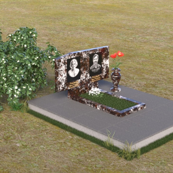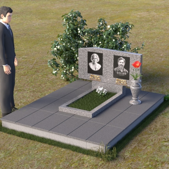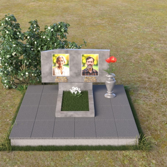 Основным элементом композиции является вертикальная плита, возвышающаяся над прямоугольным основанием. Гранитная плита имеет слегка вогнутую форму верхней грани, что придает ей мягкость и визуально облегчает массивность. На отполированной до зеркального блеска поверхности выгравированы портреты усопших, выполненные с высокой степенью детализации. Под портретами располагаются надписи с именами и датами жизни, выполненные строгим шрифтом. Вся композиция пронизана чувством сдержанности и достоинства, что позволяет сосредоточиться на главном – на памяти о тех, кого больше нет рядом.