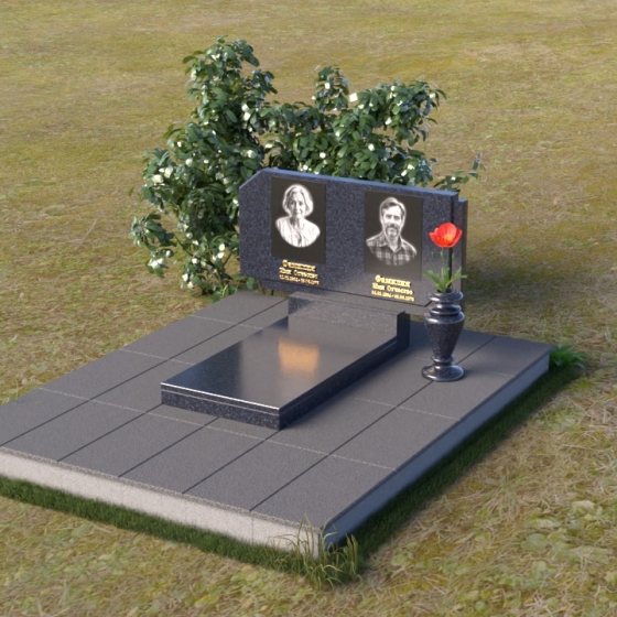 Памятник ПГ025 – это монументальное выражение скорби и вечной памяти. Его строгие линии и лаконичные формы говорят о сдержанной элегантности и глубоком уважении. Стела имеет прямоугольную форму, однако верхние углы скошены, что придает ей особую выразительность и визуальную легкость. Грани стелы тщательно отполированы, создавая зеркальную поверхность, которая отражает свет и придает камню глубину и благородство. На лицевой стороне стелы располагаются два портрета, выполненные с высокой степенью детализации. Под портретами выгравированы надписи, выполненные строгим шрифтом.