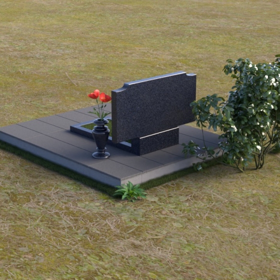 Мемориальная композиция ПГ029 представляет собой элегантную стелу из полированного гранита, установленную на широкое основание, облицованное плиткой. Верхняя часть стелы имеет мягкие, скругленные углы, придающие ей более мягкий и умиротворяющий вид. Левая и правая верхние части стелы имеют плавные вырезы, создавая эффект утонченности и легкости. Фаски по периметру стелы деликатно сглажены, что добавляет общей гармонии. Зеркальная полировка камня отражает свет, создавая ощущение сияния и подчеркивая глубину черного цвета. Под стелой расположена горизонтальная плита меньшего размера, также выполненная из полированного гранита, служащая местом для возложения цветов или установки лампады. Справа от стелы располагается ваза из черного гранита, дополняющая мемориальный ансамбль.