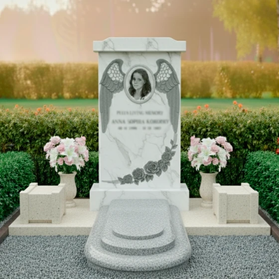 Оформление: Форма стелы ПН 135 с ее четкими линиями и плавными изгибами идеально подходит для различных видов гравировки. Овальный медальон для портрета, обрамленный крыльями ангела, создает идеальное пространство для размещения изображения усопшего, которое будет выглядеть гармонично и достойно. Пространство под портретом и цветами позволяет элегантно расположить гравировку с полным именем, датами жизни и эпитафией. Рекомендуется использовать классические шрифты, которые подчеркнут торжественность и значимость момента, а также рассмотреть возможность добавления золочения или серебрения букв для придания дополнительной выразительности и долговечности надписям. Глубокая гравировка на полированной поверхности гранита будет смотреться особенно эффектно, обеспечивая четкость и читаемость на долгие годы.