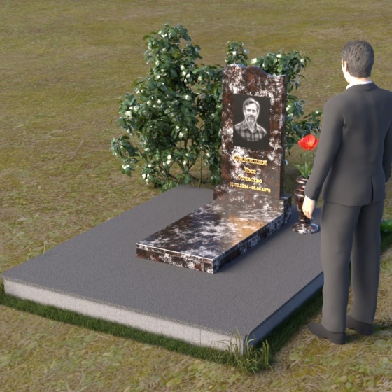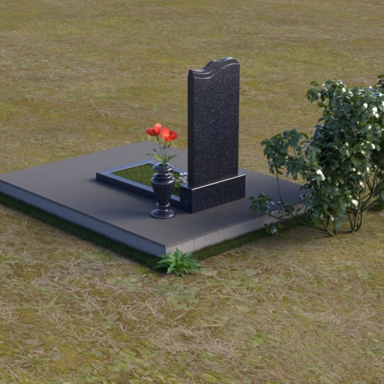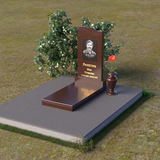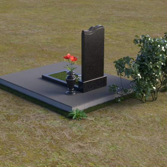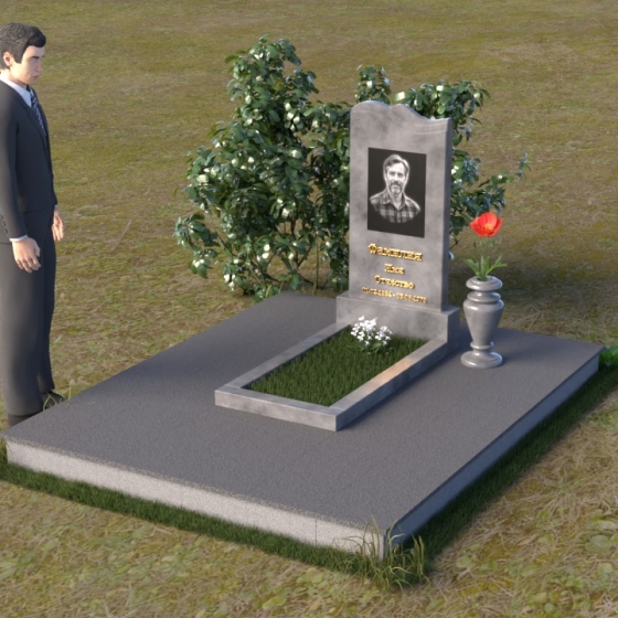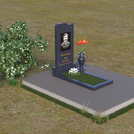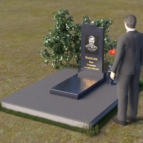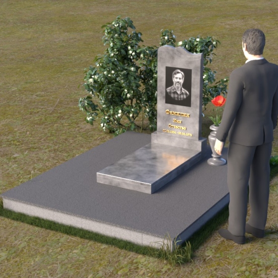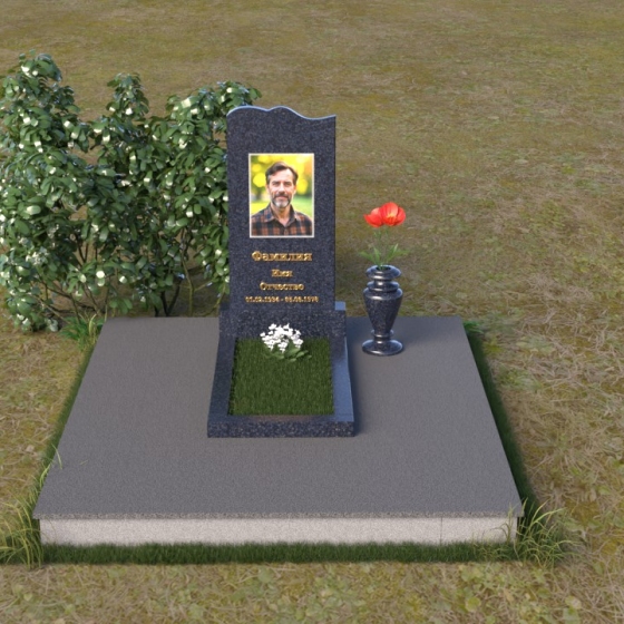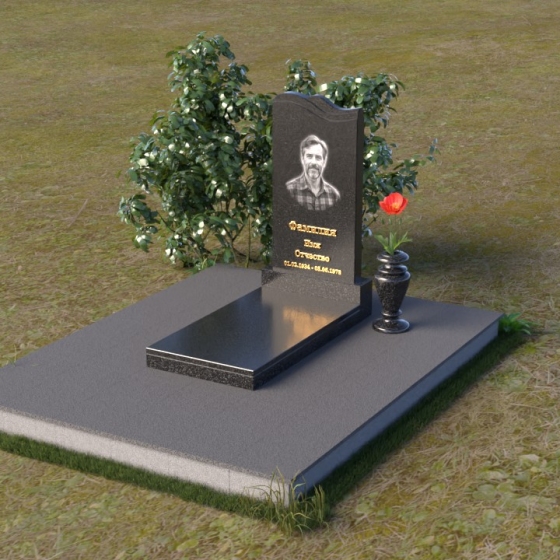 Надгробие начинается с массивного основания, выполненного в форме прямоугольной плиты. Его поверхность имеет матовую, слегка шероховатую фактуру, что создает контраст с глянцевыми элементами верхней части. На основании установлена горизонтальная плита, выполненная из полированного черного гранита. Зеркальная поверхность отражает небо и окружающий ландшафт, создавая ощущение глубины и простора. Вертикальная стела, расположенная в задней части композиции, является доминантой всего ансамбля. Ее верхняя часть имеет плавный, волнообразный изгиб, смягчающий строгие геометрические формы. На лицевой стороне стелы выгравирован портрет усопшего, а также имя, фамилия, отчество и даты жизни, выполненные золотистыми буквами. С правой стороны от стелы размещена небольшая гранитная ваза строгой формы, предназначенная для живых или искусственных цветов.